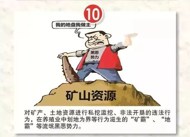 10.在工程建設、交通運輸、礦產(chǎn)資源、漁業(yè)捕撈等行業(yè)、領域,雇黑傭黑,糾集社會閑散人員,惡意競標、暴力圍標、強攬工程,非法占地、濫開濫采、暴力拆遷、隨意毆打群眾的黑惡勢力;