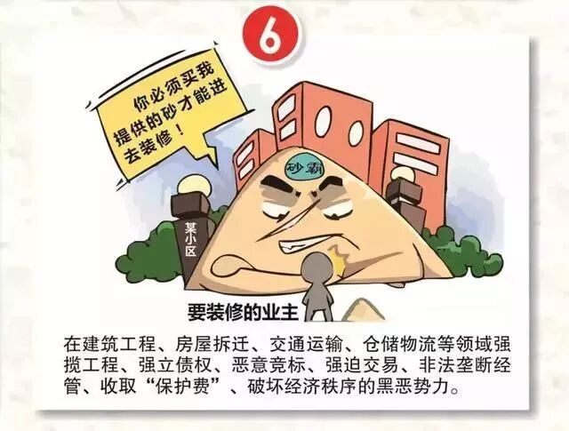 7.在建筑工地、居民小區(qū)強行供應砂石、建材,強裝強卸,隨意毆打、威脅商戶、業(yè)主的“砂霸”“水泥霸”類黑惡勢力;