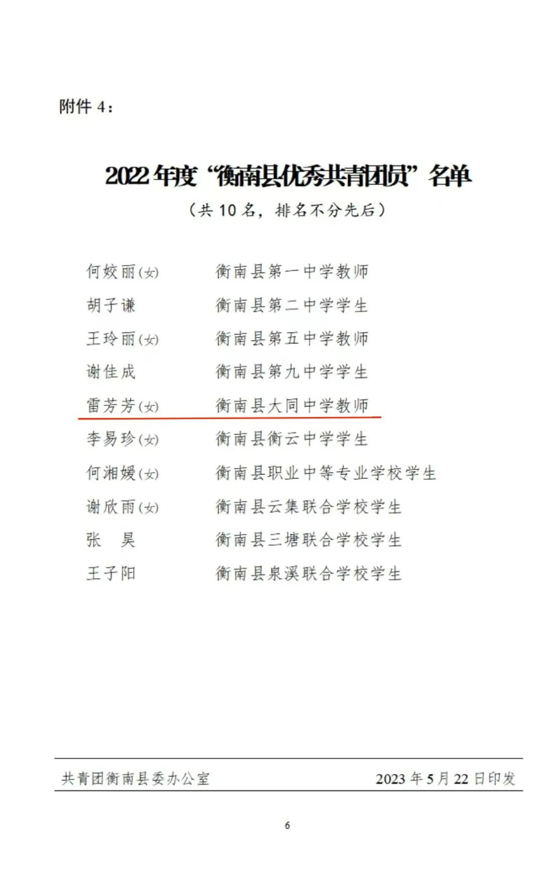 我校高中部羅衛(wèi)星老師榮獲2022年度“衡陽(yáng)市優(yōu)秀共青團(tuán)干部”稱號(hào),雷芳芳老師榮獲2022年度“衡南縣優(yōu)秀共青團(tuán)員”稱號(hào)!
